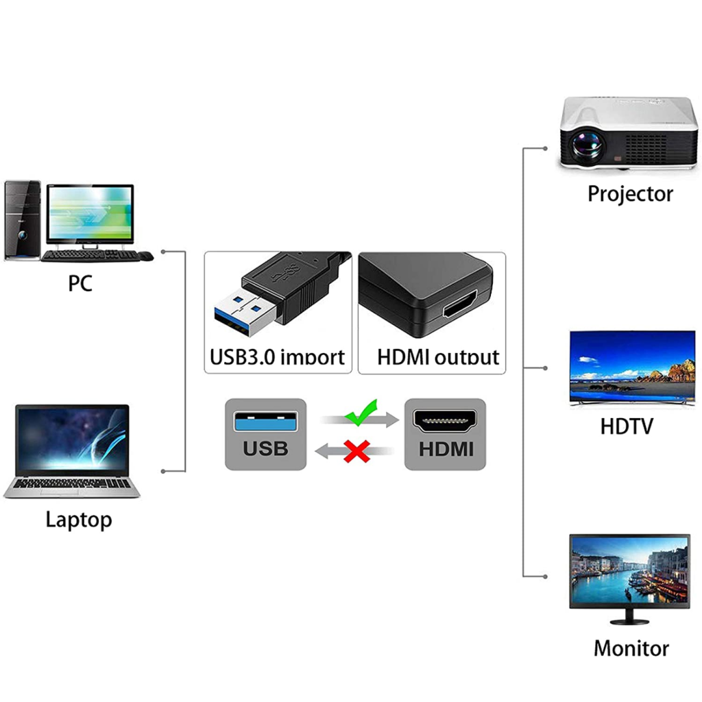 Este adaptador de USB a HDMI puede conectar una computadora a través de una interfaz USB a un HDTV, monitor o proyector con interfaz HDMI. Proporcionará fuentes de video de alta definición en la computadora a su HDTV o monitor, por lo que el problema de visualización de video externo de la computadora se resolverá fácilmente.